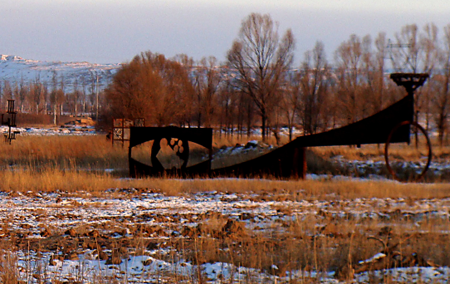 张冕把工业符号感很强的机器底座按不同的角度竖立起来,由于每个单元都有两吨重,所以只有依赖大型起重机械来配合建构,由于吊车不是随时都可以使用,所以,双方就想尽办法,经常看到张冕和助手挑灯夜战,或是蹲在高高举起的装载机挖土斗里对这些高大的构件进行焊接。最终,这些带有极少主义味道的工业结构,在苍莽的草原上一字排开,沉默庄严的力量,正是他对自然和工业自然的关系的最好阐释。他还制作了现成品集合雕塑,这些在无聊等待期间信手制作的“副产品”,却体现了张冕面对手边可以自控雕塑材料的细腻与洞察,同样带有一种由内向外的带动环境的力量。