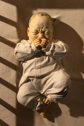 董书兵出生于大西北,曾就读于西安美院附中、中央工艺美院和中央美院,现任清华大学美术学院雕塑系副主任。婴儿系列的创作冲动来自董书兵女儿的出生。此次展览的策展人北人在介绍文章中说,2003年董书兵初为人父,所谓“回眸时看小于菟”,他被女儿的哭声逗笑了。襁褓中的婴儿,清脆的啼哭,一声一声的唤醒了董书兵内心深处那块柔软的地方,从此之后他开始了以婴儿为主题的系列创作。