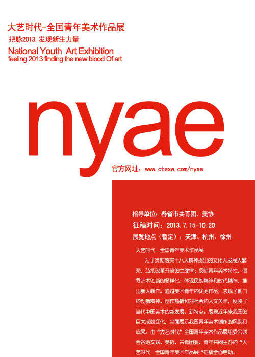 大学生艺术在线讯:由中国美术研究协会、青年艺术家联盟、天津红桥区团委、天津市红桥区青年联合会、大学生艺术在线、天津意库创意产业园、天津青年创业园、中国·映像江南艺术馆、江苏影立方文化传媒、天津艺卓文化、天津微卓科技、北京卓艺梵程国际文化传媒、杭州市艺术家俱乐部等共同组织协办的“大艺时代—全国青年美术作品展”(以下简称“大艺时代青年美展”)于2013年7月启动征稿,2014年初在天津、杭州、徐州等地展览。
